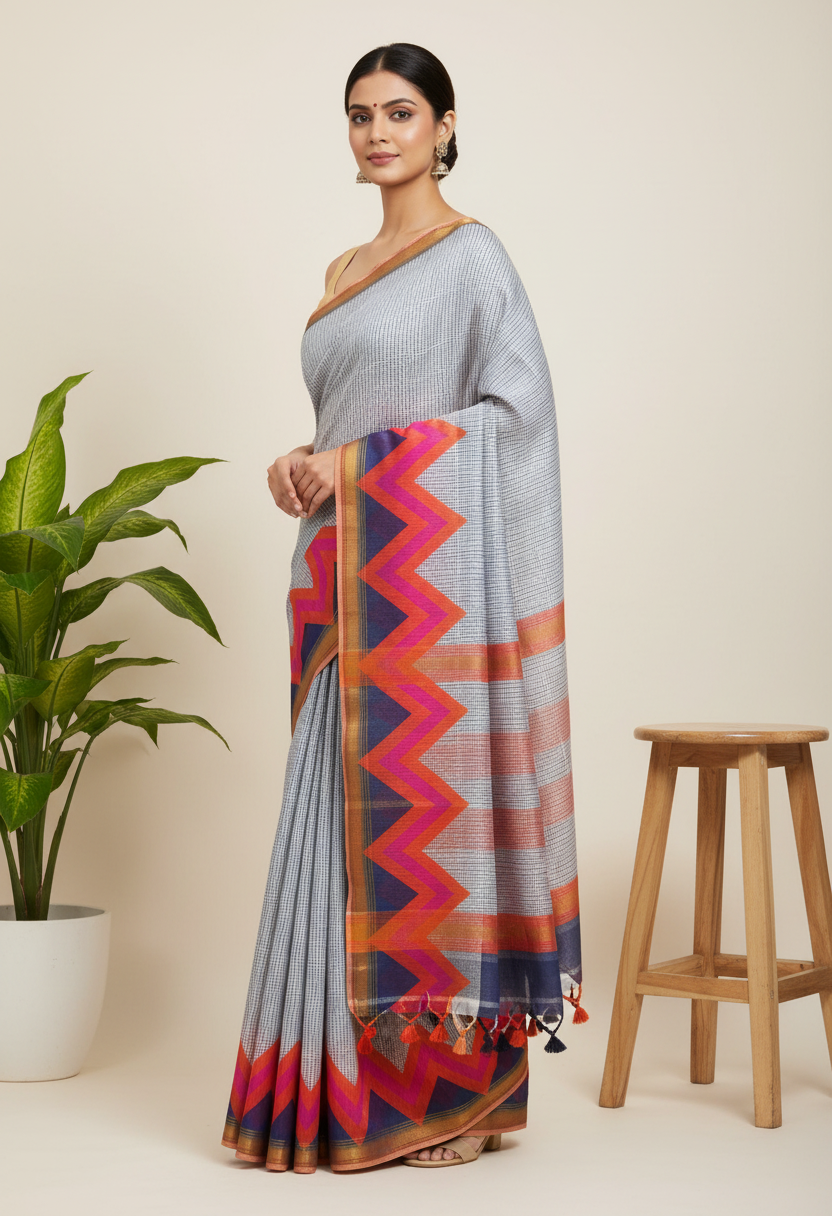 GEOMETRIC ZIGZAG BORDER COTTON SAREE WITH ORANGE AND BLACK BORDER AND CHECKED GREY BODY