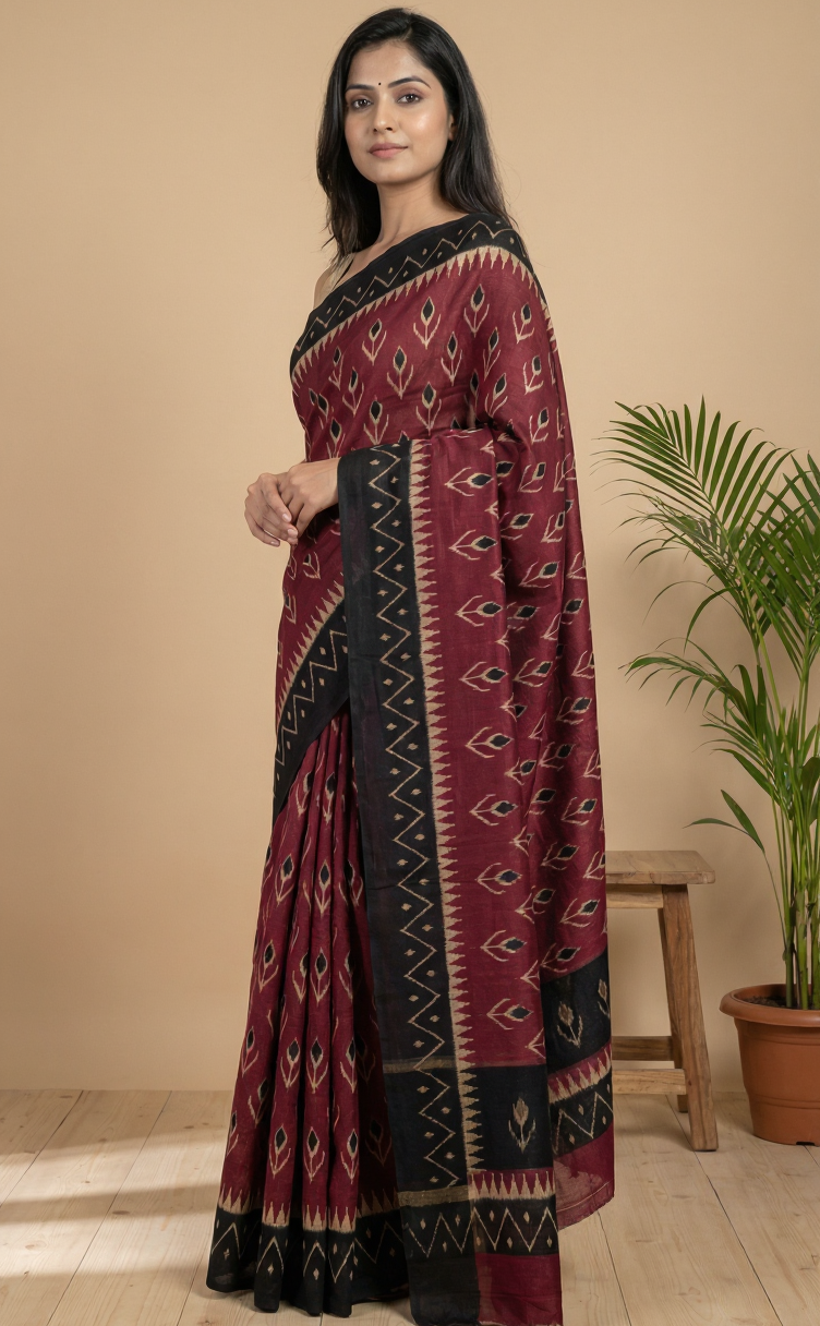 Design: Rich Maroon Crape Silk Saree intricate with Tulip motifs contrasted by bold golden zig zag pattern on the black border
