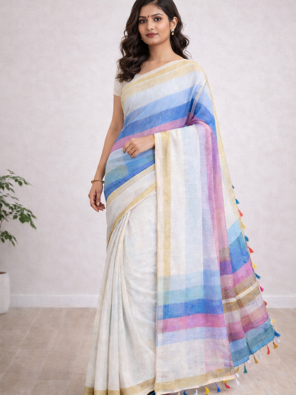 WHITE LINEN RAINBOW STRIPED COTTON SAREE