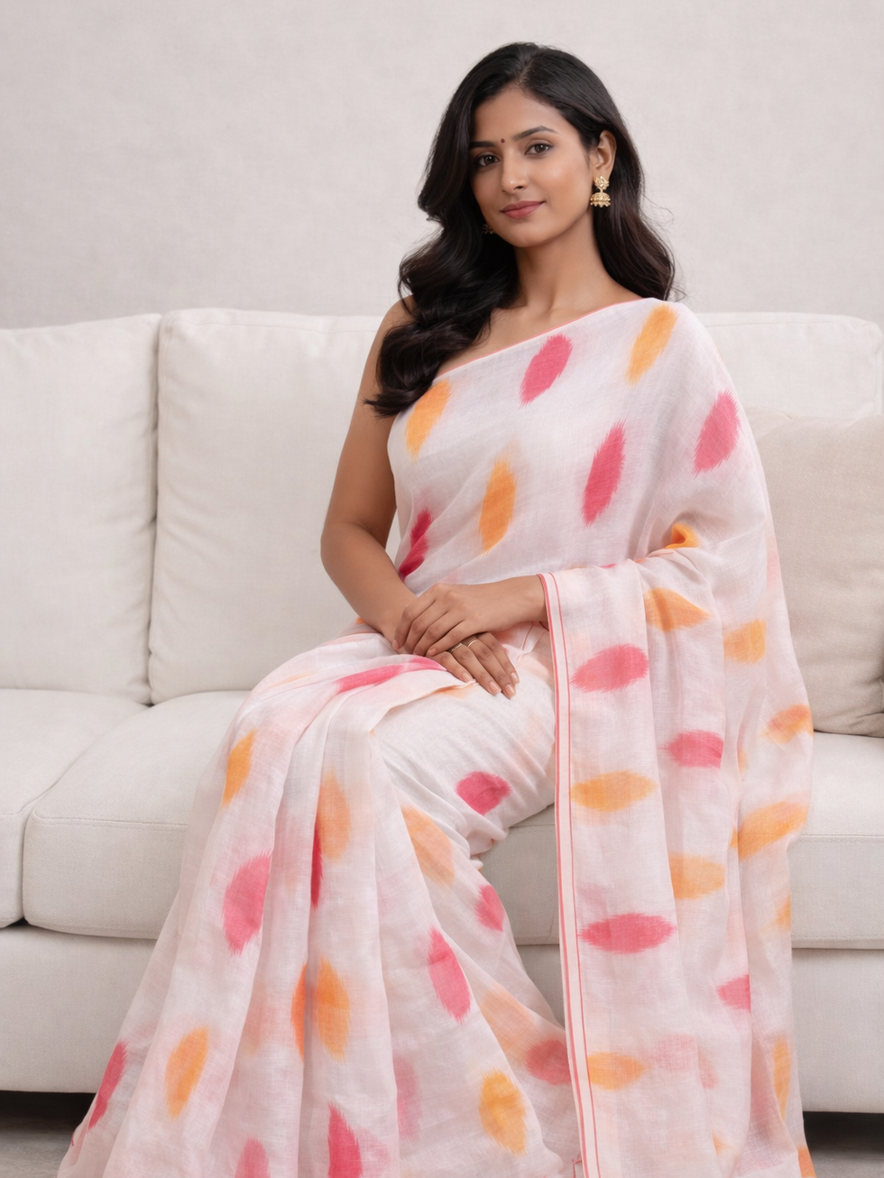 Design: White linen saree with traditional ikkat pattern detailing with scallop borders all over the border and blouse piece with sequel floral mirror work.